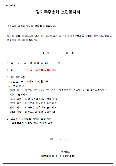 홈 생활서식 [서식] 정기주주총회소집통지서 [서식] 정기주주총회소집통지서 하보니 2월 05, 2021 서 식 명: 정기주주총회소집통지서서식 포맷: 파일 다운로드: 정기주주총회소집통지서.xls Tags: 문서/서식생활서식 Facebook Twitter Whatsapp 다음 이전