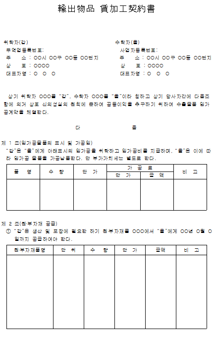 홈 문서/서식 [서식] 내수출물품 임가공계약서 [서식] 내수출물품 임가공계약서 하보니 2월 20, 2021 서 식 명: 내수출물품 임가공계약서 서식 포맷: 파일 다운로드: 내수출물품 임가공계약서.zip Tags: 계약서문서/서식 Facebook Twitter Whatsapp 다음 이전