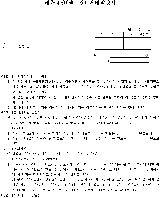홈 민원/행정 [서식] 매출채권(팩토링) 거래약정서 [서식] 매출채권(팩토링) 거래약정서 하보니 2월 21, 2021 서 식 명: 매출채권(팩토링) 거래약정서 서식 포맷: 파일 다운로드: 매출채권(팩토링) 거래약정서.zip Tags: 문서/서식민원/행정 Facebook Twitter Whatsapp 다음 이전