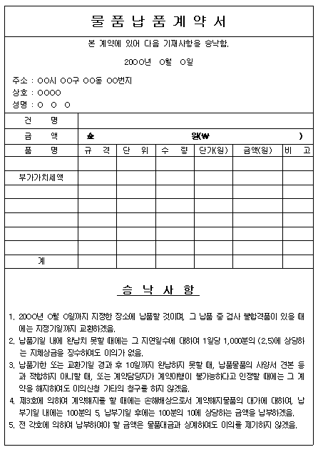 홈 문서/서식 [서식] 물품 납품 계약서 [서식] 물품 납품 계약서 하보니 2월 21, 2021 서 식 명: 물품 납품 계약서 서식 포맷: 파일 다운로드: 물품납품계약서.zip Tags: 계약서문서/서식 Facebook Twitter Whatsapp 다음 이전