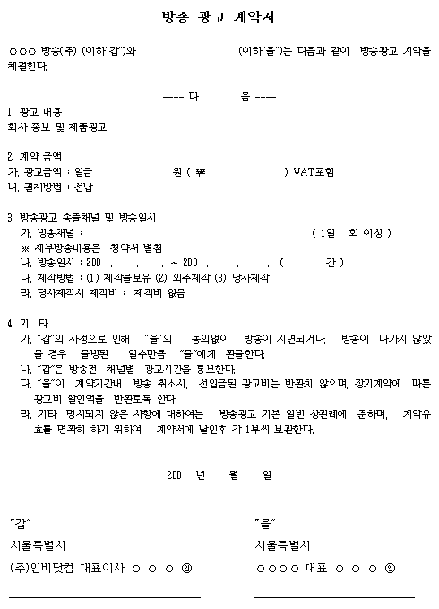홈 문서/서식 [서식] 방송 광고 계약서 [서식] 방송 광고 계약서 하보니 2월 21, 2021 서 식 명: 방송 광고 계약서 서식 포맷: 파일 다운로드: 방송 광고 계약서.zip Tags: 계약서문서/서식 Facebook Twitter Whatsapp 다음 이전