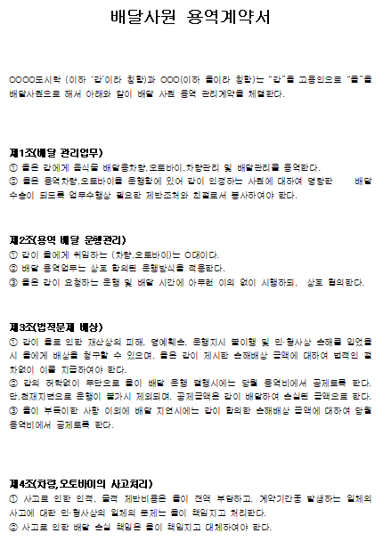 홈 문서/서식 [서식] 배달사원 용역계약서 [서식] 배달사원 용역계약서 하보니 2월 21, 2021 서 식 명: 배달사원 용역계약서 서식 포맷: 파일 다운로드: 배달사원 용역계약서.zip Tags: 계약서문서/서식 Facebook Twitter Whatsapp 다음 이전