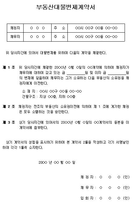홈 문서/서식 [서식] 부동산 대물변제 계약서 [서식] 부동산 대물변제 계약서 하보니 2월 21, 2021 서 식 명: 부동산 대물변제 계약서 서식 포맷: 파일 다운로드: 부동산대물변제계약서.zip Tags: 계약서문서/서식 Facebook Twitter Whatsapp 다음 이전