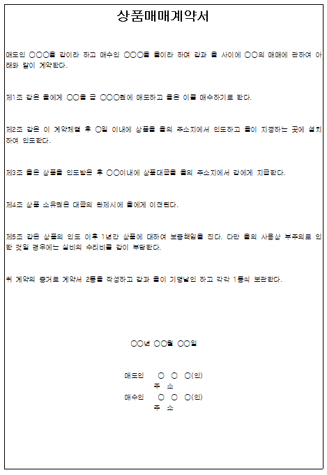 홈 문서/서식 [서식] 상품매매 계약서 (3종) [서식] 상품매매 계약서 (3종) 하보니 2월 22, 2021 서 식 명: 상품매매 계약서 (3종)서식 포맷: 파일 다운로드: 상품매매 계약서 (3종).zip Tags: 계약서문서/서식 Facebook Twitter Whatsapp 다음 이전