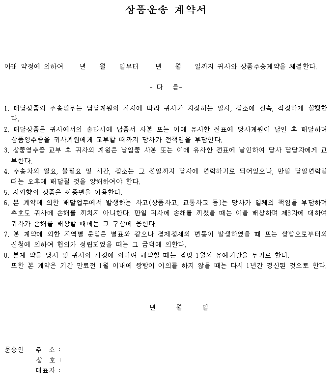 홈 문서/서식 [서식] 상품운송계약서 [서식] 상품운송계약서 하보니 2월 22, 2021 서 식 명: 상품운송계약서서식 포맷: 파일 다운로드: 상품운송계약서.zip Tags: 계약서문서/서식 Facebook Twitter Whatsapp 다음 이전