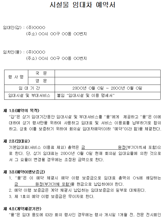 홈 문서/서식 [서식] 시설물임대계약서 [서식] 시설물임대계약서 하보니 2월 22, 2021 서 식 명: 시설물임대계약서서식 포맷: 파일 다운로드: 시설물임대계약서.zip Tags: 계약서문서/서식 Facebook Twitter Whatsapp 다음 이전