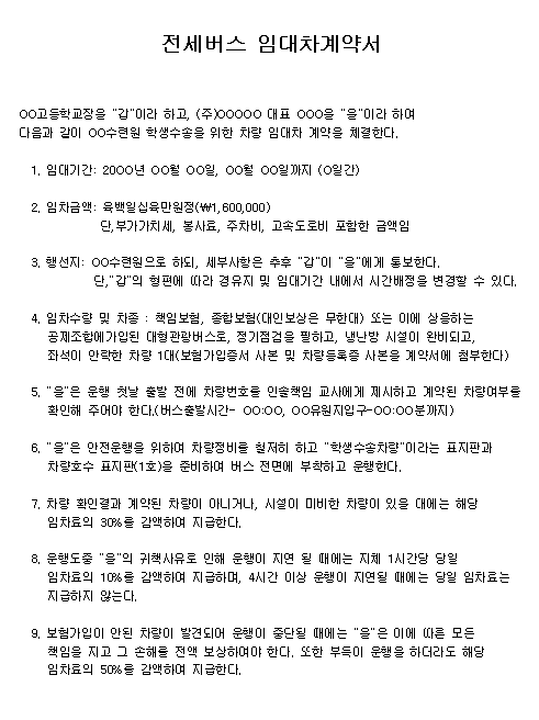 홈 문서/서식 [서식] 전세버스 임대차계약서 [서식] 전세버스 임대차계약서 하보니 2월 24, 2021 서 식 명: 전세버스 임대차계약서 서식 포맷: 파일 다운로드: 전세버스 임대차계약서.zip Tags: 계약서문서/서식 Facebook Twitter Whatsapp 다음 이전