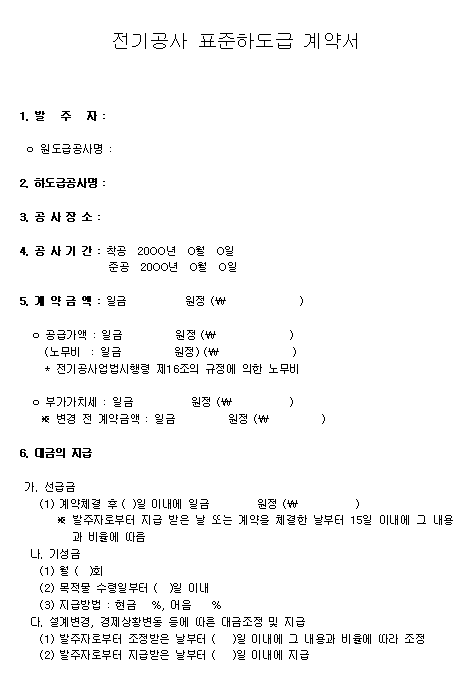 홈 문서/서식 [서식] 전기공사업종 표준하도급계약서 [서식] 전기공사업종 표준하도급계약서 하보니 2월 25, 2021 서 식 명: 전기공사업종 표준하도급계약서 서식 포맷: 파일 다운로드: 전기공사업종 표준하도급계약서.zip Tags: 계약서문서/서식 Facebook Twitter Whatsapp 다음 이전