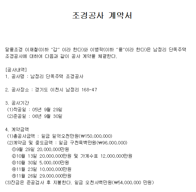 홈 문서/서식 [서식] 조경공사 계약서 [서식] 조경공사 계약서 하보니 2월 25, 2021 서 식 명: 조경공사 계약서 서식 포맷: 파일 다운로드: 조경공사 계약서.zip Tags: 계약서문서/서식 Facebook Twitter Whatsapp 다음 이전