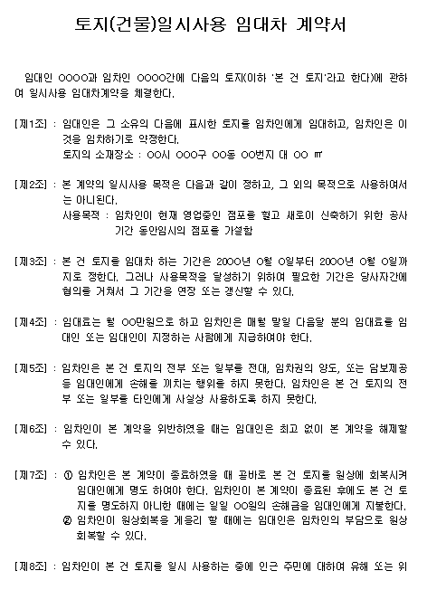 홈 문서/서식 [서식] 토지 (건물) 일시사용 임대차 계약서 [서식] 토지 (건물) 일시사용 임대차 계약서 하보니 2월 26, 2021 서 식 명: 토지 (건물) 일시사용 임대차 계약서서식 포맷: 파일 다운로드: 토지(건물)일시사용임대차계약서.zip Tags: 계약서문서/서식 Facebook Twitter Whatsapp 다음 이전