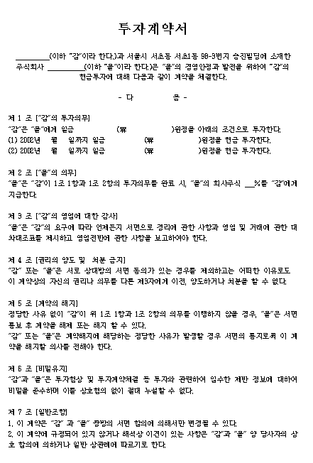 홈 문서/서식 [서식] 투자계약서 (일반) [서식] 투자계약서 (일반) 하보니 2월 26, 2021 서 식 명: 투자계약서 (일반)서식 포맷: 파일 다운로드: 투자계약서.zip Tags: 계약서문서/서식 Facebook Twitter Whatsapp 다음 이전