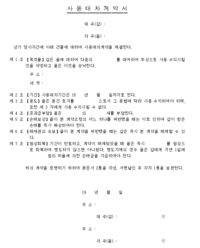 홈 문서/서식 [서식] 건물 사용대차계약서 [서식] 건물 사용대차계약서 하보니 2월 27, 2021 서 식 명: 건물 사용대차계약서서식 포맷: 파일 다운로드: 건물 사용대차계약서.hwp Tags: 계약서문서/서식 Facebook Twitter Whatsapp 다음 이전