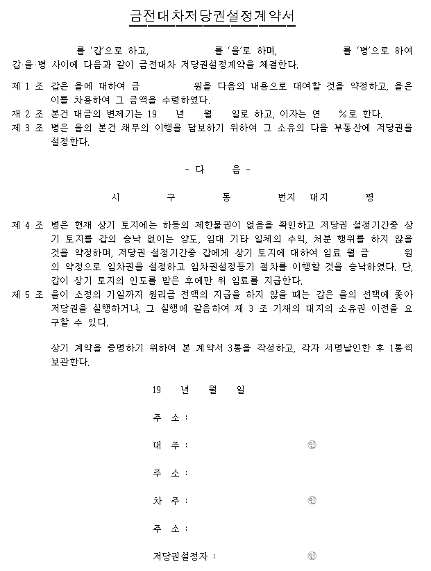 홈 문서/서식 [서식] 금전대차저당권설정계약서 [서식] 금전대차저당권설정계약서 하보니 2월 27, 2021 서 식 명: 금전대차저당권설정계약서서식 포맷: 파일 다운로드: 금전대차저당권설정계약서.hwp Tags: 계약서문서/서식 Facebook Twitter Whatsapp 다음 이전