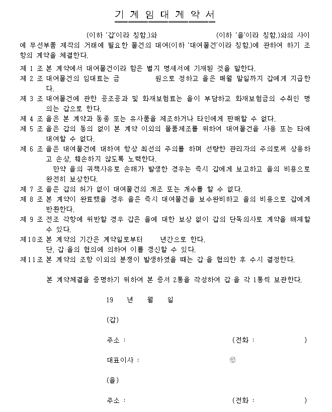 홈 문서/서식 [서식] 기계임대계약서 [서식] 기계임대계약서 하보니 2월 27, 2021 서 식 명: 기계임대계약서서식 포맷: 파일 다운로드: 기계임대계약서.hwp Tags: 계약서문서/서식 Facebook Twitter Whatsapp 다음 이전