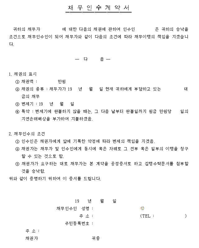 홈 문서/서식 [서식] 채무인수계약서 [서식] 채무인수계약서 하보니 2월 27, 2021 서 식 명: 채무인수계약서 서식 포맷: 파일 다운로드: 채무인수계약서.hwp Tags: 계약서문서/서식 Facebook Twitter Whatsapp 다음 이전