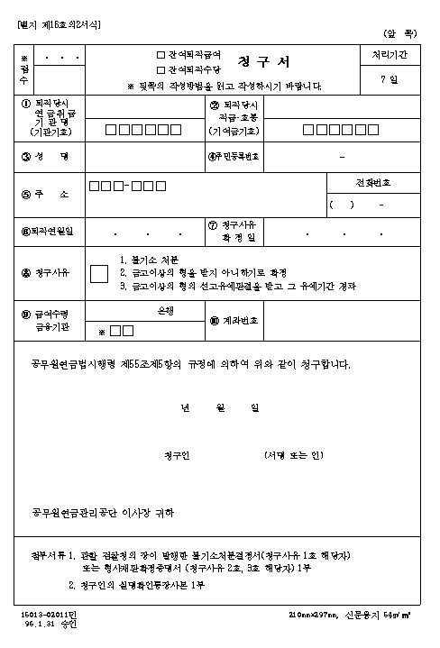 홈 민원/행정 [서식] 잔여퇴직급여 수당청구서 (행정자치부) [서식] 잔여퇴직급여 수당청구서 (행정자치부) 하보니 2월 27, 2021 서 식 명: 잔여퇴직급여 수당청구서 (행정자치부) 서식 포맷: 파일 다운로드: 잔여퇴직급여-수당청구서_행정자치부.hwp Tags: 문서/서식민원/행정 Facebook Twitter Whatsapp 다음 이전
