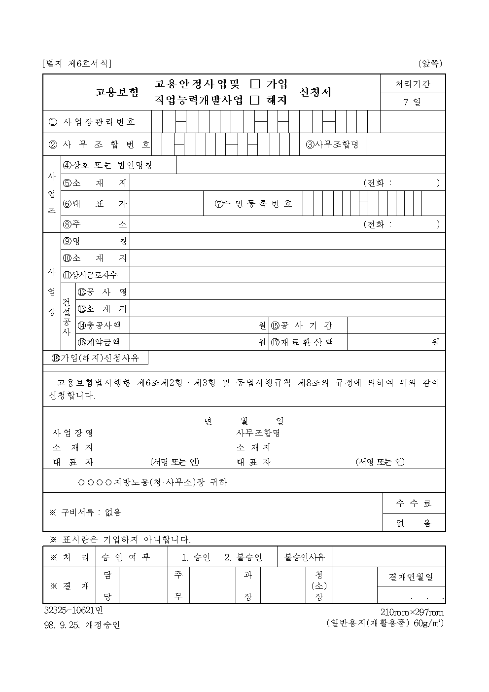 홈 민원/행정 [서식] 고용보험 (고용안정사업 및 직업능력개발사업 가입, 해지) 신청서 [서식] 고용보험 (고용안정사업 및 직업능력개발사업 가입, 해지) 신청서 하보니 2월 28, 2021 서 식 명: 고용보험 (고용안정사업 및 직업능력개발사업 가입, 해지) 신청서 서식 포맷: 파일 다운로드: 고용보험(고용안정사업및 직업능력개발사업 가입,해지)신청서.zip Tags: 문서/서식민원/행정 Facebook Twitter Whatsapp 다음 이전