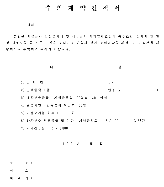 홈 회사서식 [서식] 수의계약 견적서 공사관리 [서식] 수의계약 견적서 공사관리 하보니 2월 27, 2021 서 식 명: 수의계약 견적서 공사관리 서식 포맷: 파일 다운로드: 수의계약 견적서_공사관리.hwp Tags: 문서/서식회사서식 Facebook Twitter Whatsapp 다음 이전