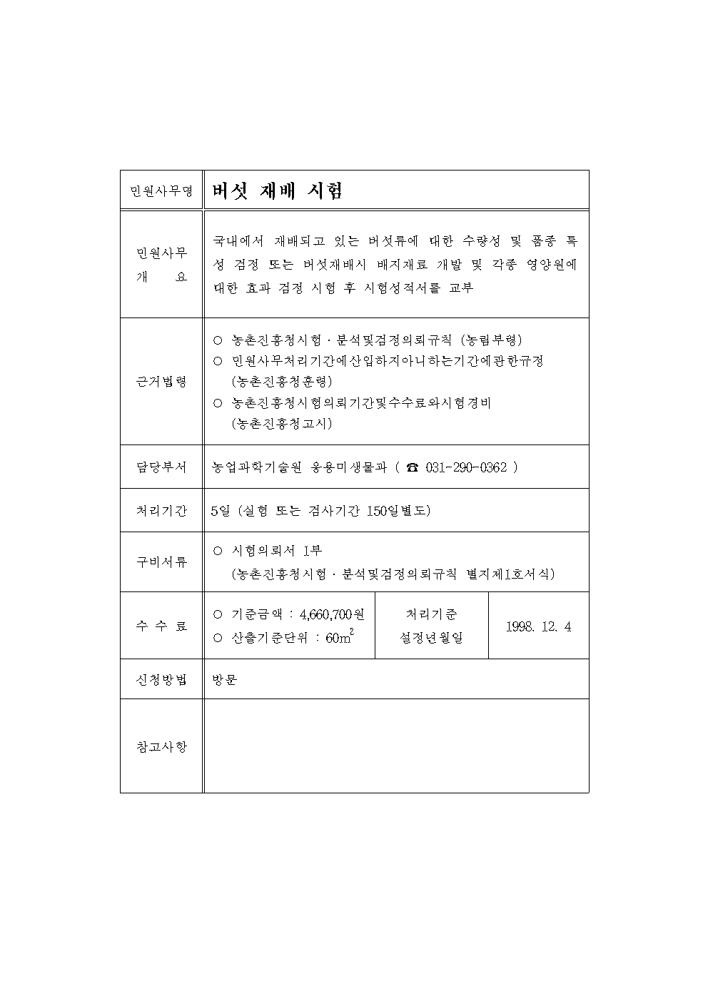 홈 민원/행정 [서식] 버섯재배 시험(분석, 검정) 의뢰서 및 결과통지서 [서식] 버섯재배 시험(분석, 검정) 의뢰서 및 결과통지서 하보니 3월 01, 2021 서 식 명: 버섯재배 시험(분석, 검정) 의뢰서 및 결과통지서 서식 포맷: 파일 다운로드: 버섯재배 시험(분석, 검정) 의뢰서 및 결과통지서.zip Tags: 문서/서식민원/행정 Facebook Twitter Whatsapp 다음 이전