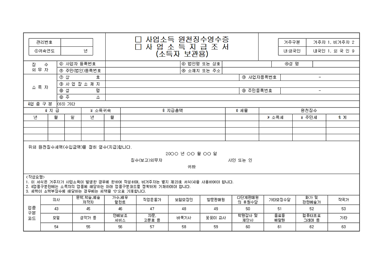 홈 민원/행정 [서식] 사업소득원천징수영수증 (소득자보관용) [서식] 사업소득원천징수영수증 (소득자보관용) 하보니 3월 01, 2021 서 식 명: 사업소득원천징수영수증(소득자보관용)서식 포맷: 파일 다운로드: 사업소득원천징수영수증(소득자보관용).hwp Tags: 문서/서식민원/행정 Facebook Twitter Whatsapp 다음 이전