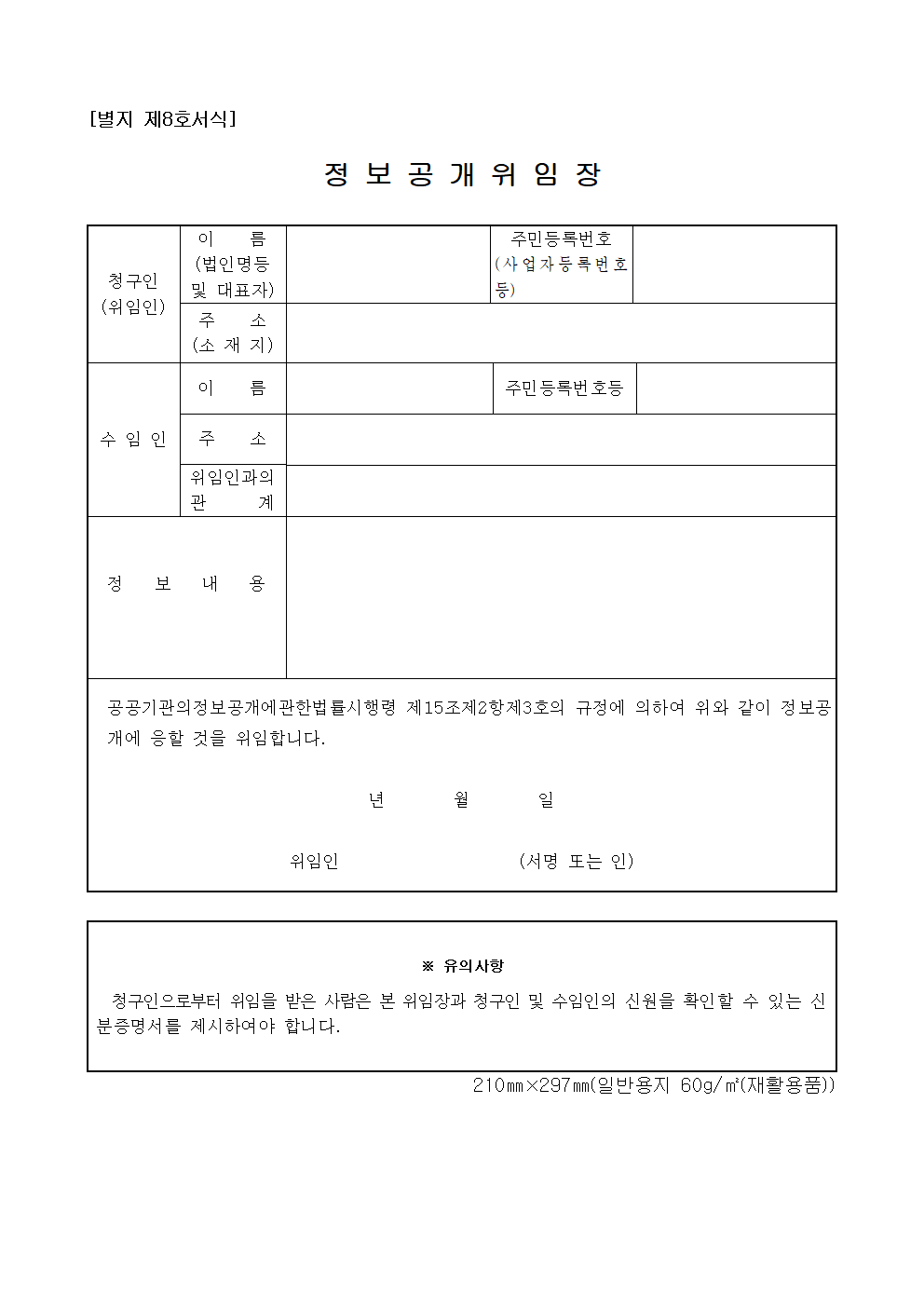홈 민원/행정 [서식] 정보공개 위임장 (2종) [서식] 정보공개 위임장 (2종) 하보니 3월 02, 2021 서 식 명: 정보공개위임장 (2종)서식 포맷: 파일 다운로드: 정보공개위임장 (2종).zip Tags: 문서/서식민원/행정 Facebook Twitter Whatsapp 다음 이전