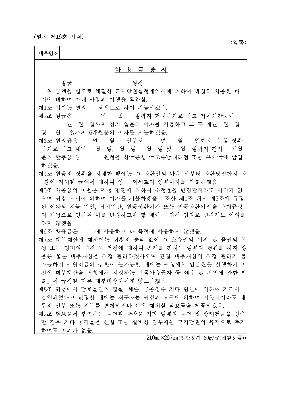 홈 민원/행정 [서식] 차용금증서 [서식] 차용금증서 하보니 3월 03, 2021 서 식 명: 차용금증서 서식 포맷: 파일 다운로드: 차용금증서.zip Tags: 문서/서식민원/행정 Facebook Twitter Whatsapp 다음 이전