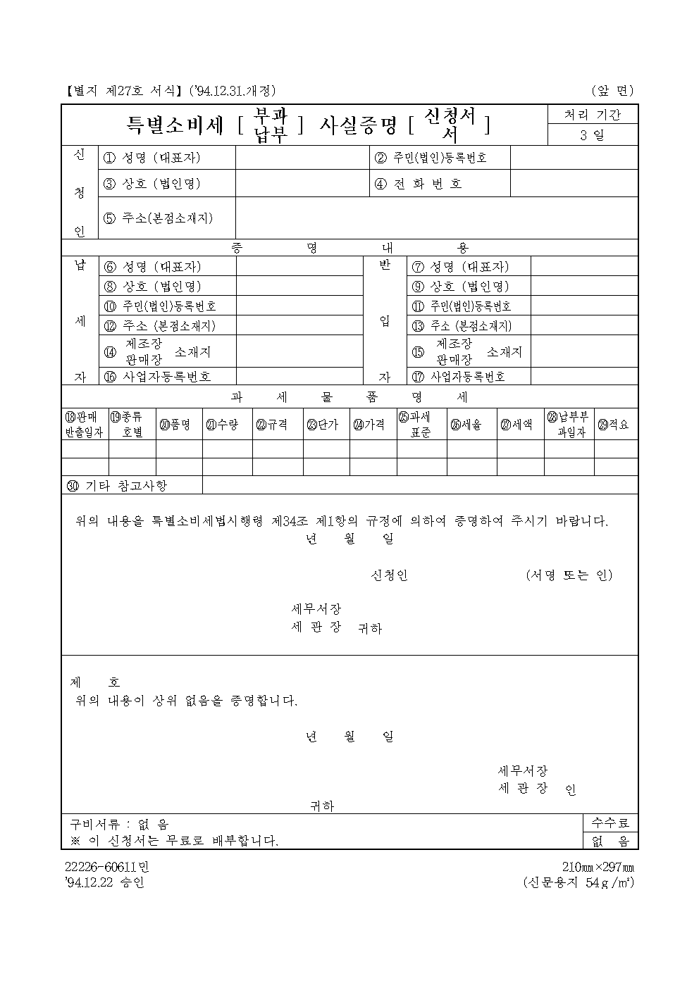 홈 민원/행정 [서식] 특별소비세 (부과, 납부) 사실증명 (신청서, 서) [서식] 특별소비세 (부과, 납부) 사실증명 (신청서, 서) 하보니 3월 03, 2021 서 식 명: 특별소비세 (부과, 납부) 사실증명 (신청서, 서) 서식 포맷: 파일 다운로드: 특별소비세(부과,납부)사실증명(신청서,서).zip Tags: 문서/서식민원/행정 Facebook Twitter Whatsapp 다음 이전