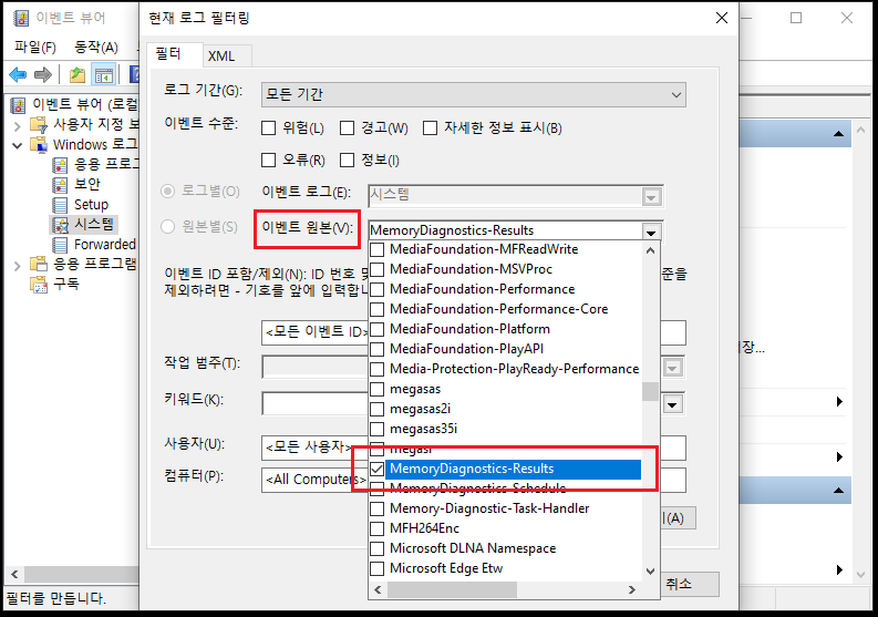 ‘이벤트 원본‘ 항목의 ‘MemoryDiagonostics-Results’를 체크해주고 ‘확인’을 선택합니다.
