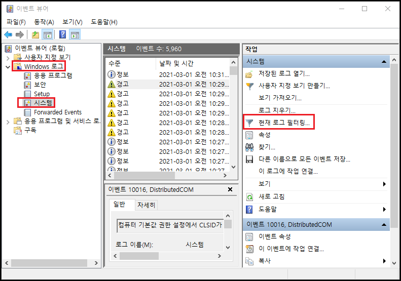 ‘windows 로그 > 시스템 -> “현재 로그 필터링‘을 클릭합니다.