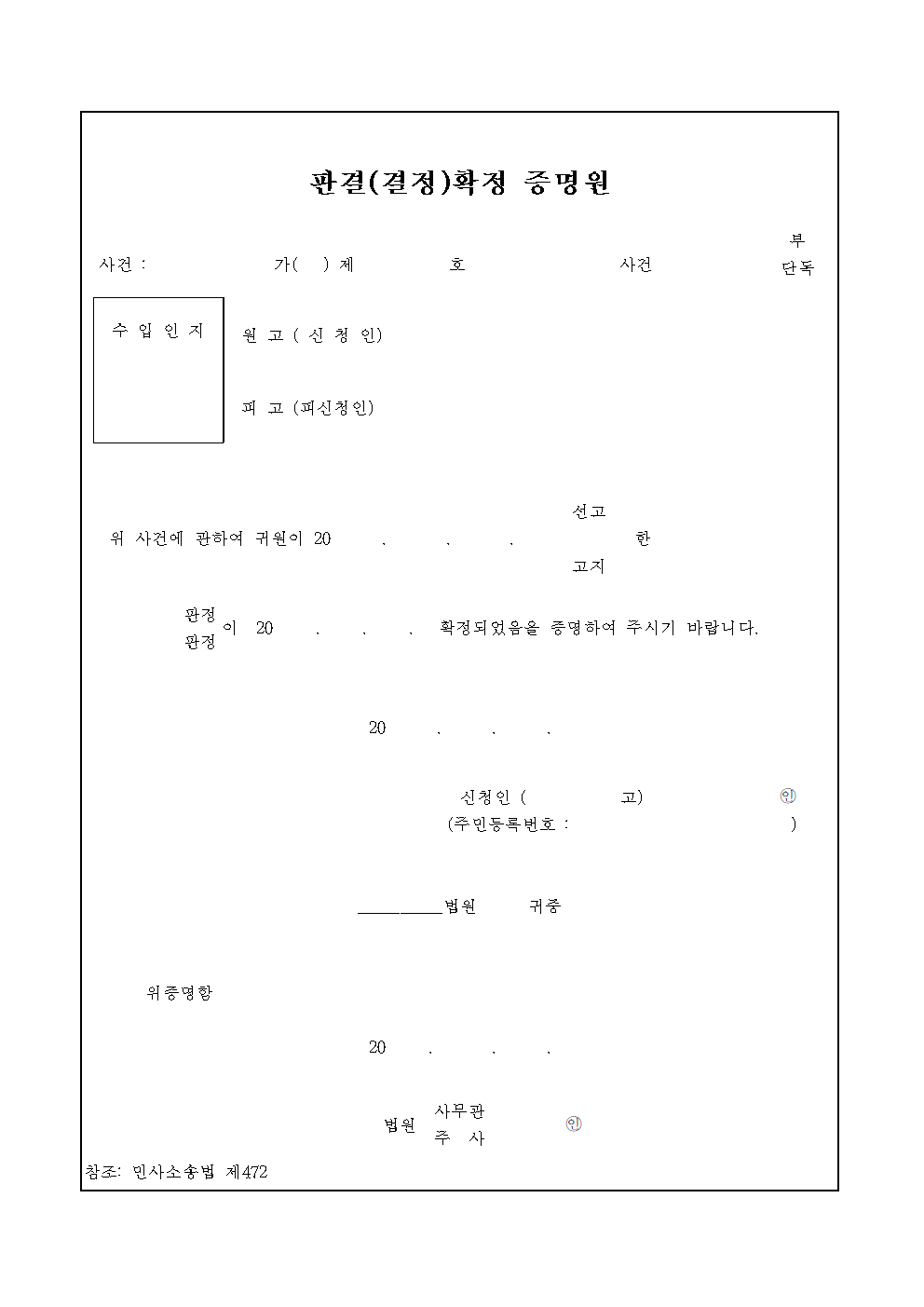 홈 민원/행정 [서식] 판결,결정확정증명원 [서식] 판결,결정확정증명원 하보니 2월 06, 2023 서 식 명: 판결,결정확정증명원서식 포맷: 파일 다운로드: 판결,결정확정증명원.zip Tags: 문서/서식민원/행정 Facebook Twitter Whatsapp 다음 이전