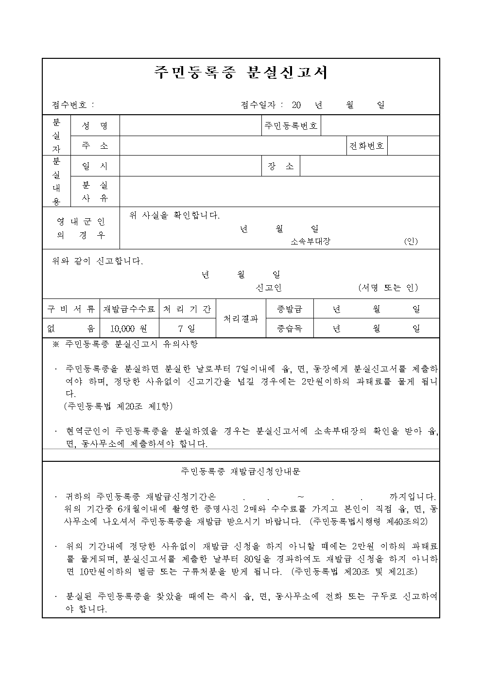 홈 민원/행정 [서식] 주민등록증 분실신고서 [서식] 주민등록증 분실신고서 하보니 7월 14, 2023 서 식 명: 주민등록증 분실신고서서식 포맷: 파일 다운로드: 주민등록증 분실신고서.zip Tags: 문서/서식민원/행정 Facebook Twitter Whatsapp 다음 이전